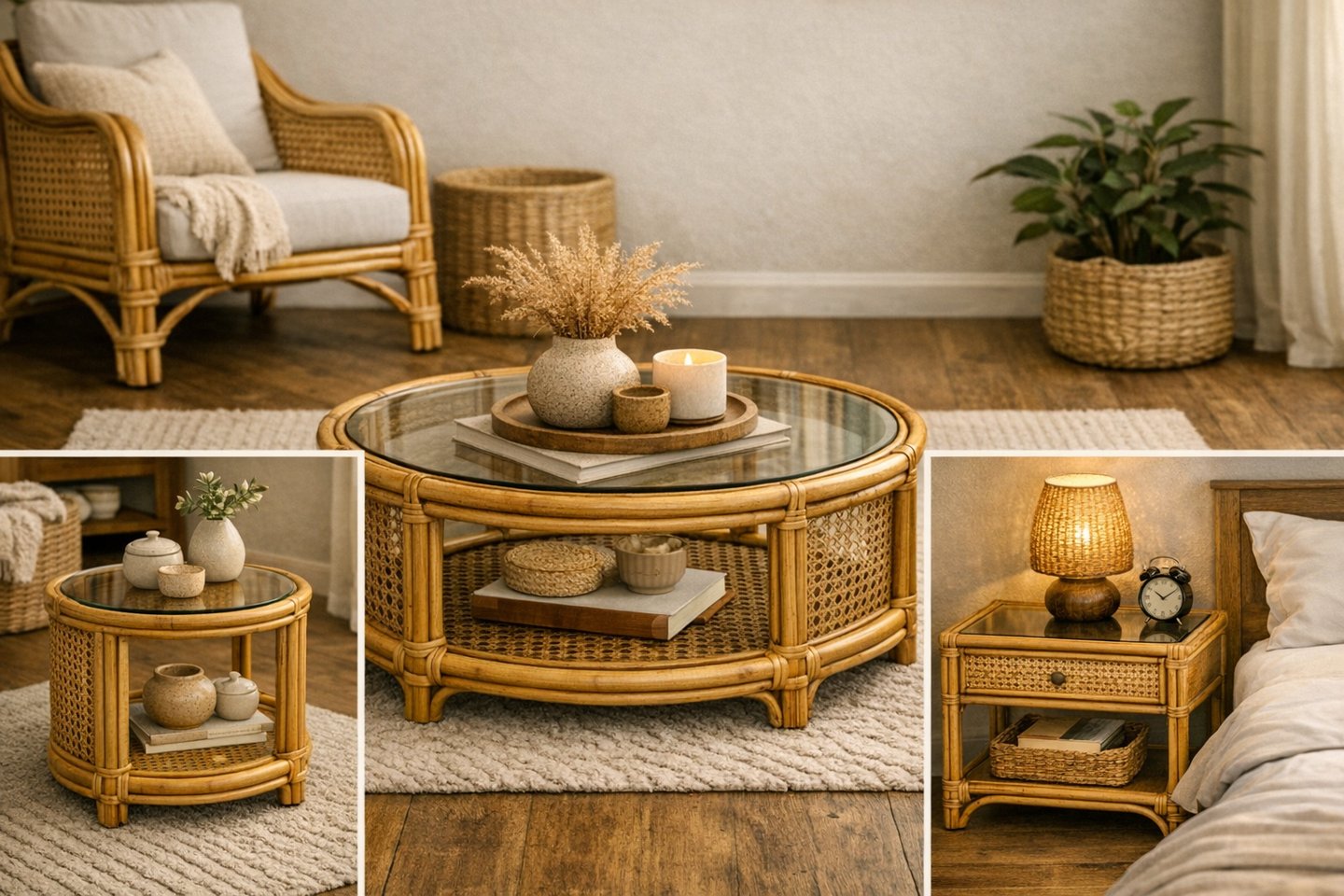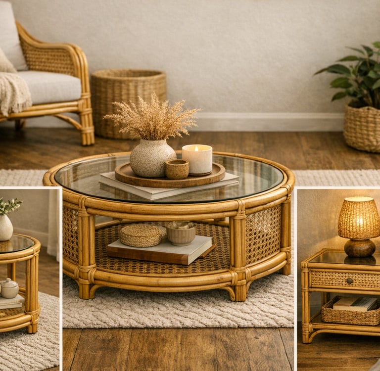 Minimalist yet striking, cane tables combine natural textures with functional design. Often paired with glass tops, they serve as stylish coffee tables, side companions, or bedside accents.
