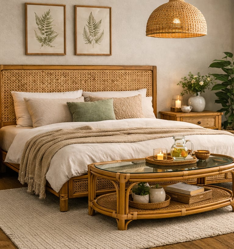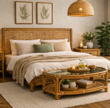 Rustic charm meets sustainable living—cane beds feature intricately woven headboards and sturdy frames. Ideal for bedrooms that celebrate nature-inspired luxury.