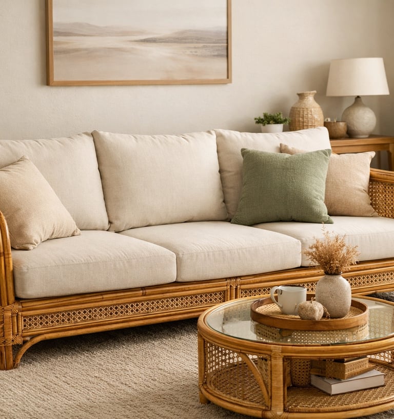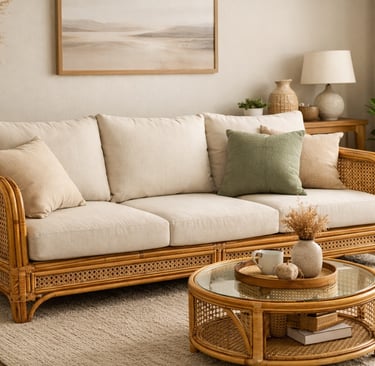 Handwoven elegance meets comfort—crafted from natural cane, these sofas bring a touch of eco-luxury to your living space. Lightweight yet durable, they pair seamlessly with plush cushions for a refined lounge experience.
