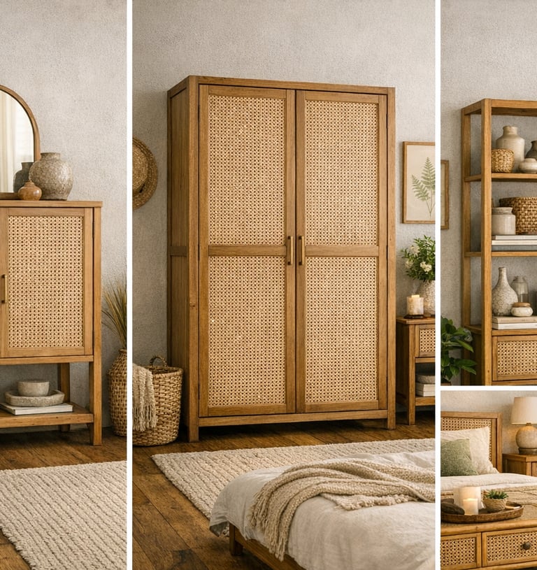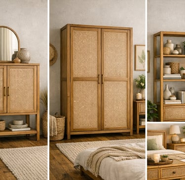 Cabinets, wardrobes, and shelves with cane panels add warmth and texture to interiors. They balance modern utility with handcrafted artistry, making storage a statement piece.