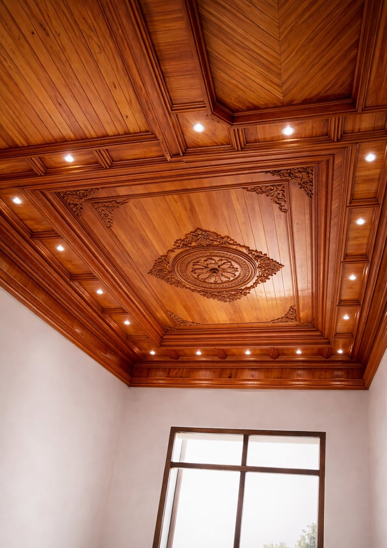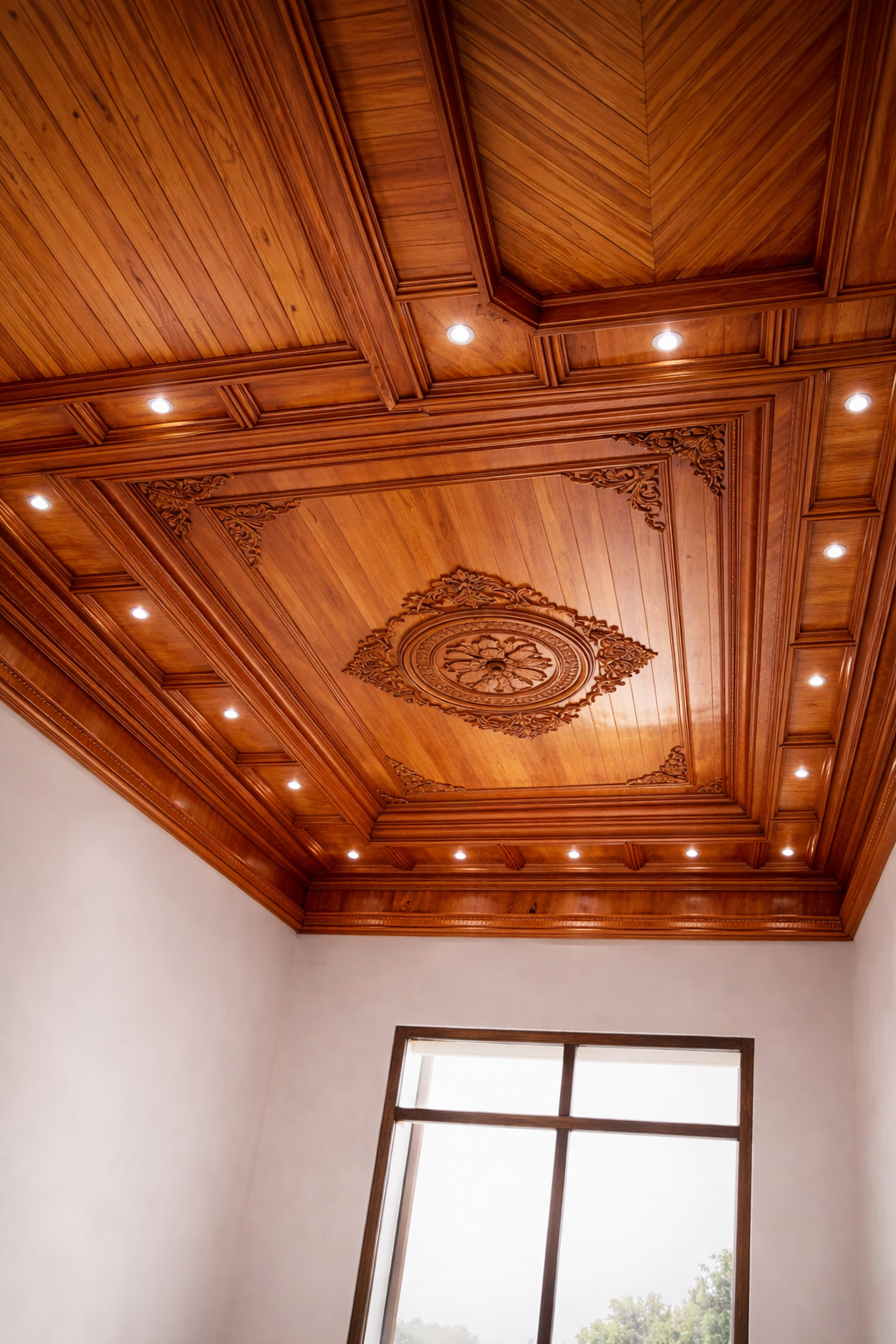 Handcrafted wooden ceiling designs that add depth, elegance, and timeless beauty to any interior space.