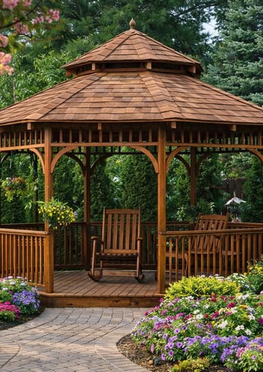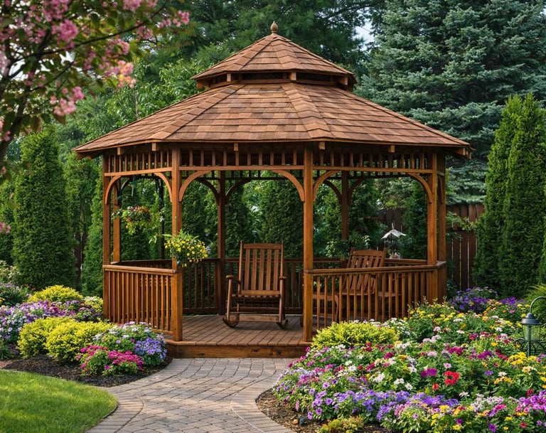 A beautifully handcrafted wooden gazebo designed for serene garden retreats. Its natural finish and elegant arches create a timeless outdoor centerpiece