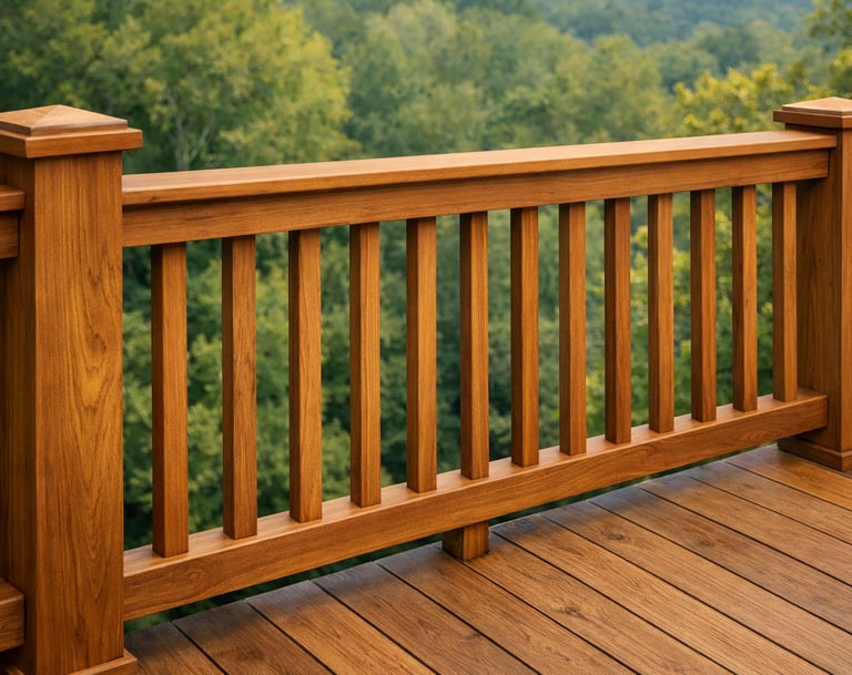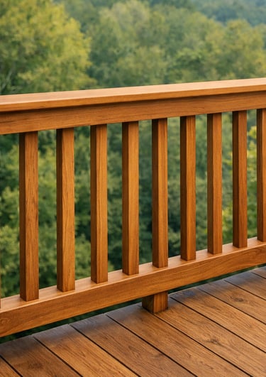 A beautifully crafted wooden railing featuring smooth handrails, sturdy square posts, and evenly spaced vertical balusters. The warm honey-toned finish highlights the natural wood grain, creating a perfect blend of strength and aesthetic appeal for outdoor decks or balconies overlooking lush greenery.